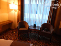 Номер тускло освещается парой настольных ламп и торшером. Мрачновато, особенно, если учесть, что стекла на окнах тонированные. А вид окна –в- окна на соседний отель.