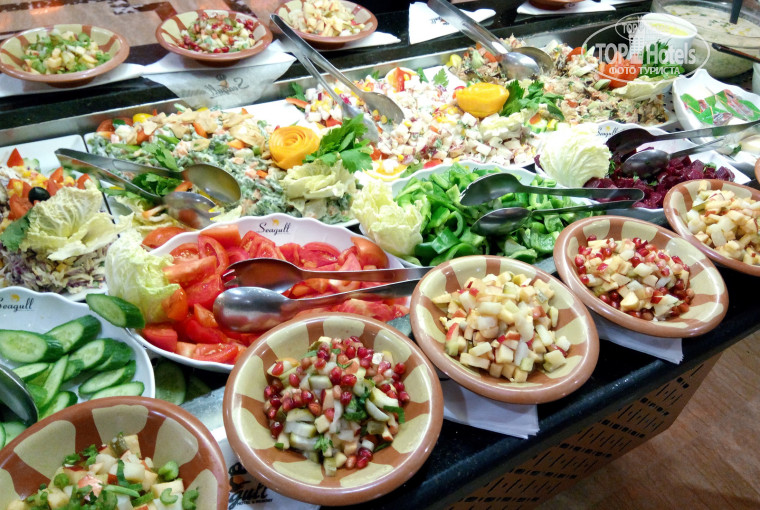 Питание. Мы завтракали в нашем ресторане, а ужинали в старом сигале, зал больше и свободные столики есть всегда. На фудкорте в обед 4 кухни: индийская, итальянская, китайская и восточная. Мороженое 2 видов в пляжном баре Дельфин в старом сигале всем желающим, закуски, напитки. По питанию вообще без претензий, выбор отличный, все вкусно. Очень даже приличные супы на обед и ужин. Вино розовое из бутылок, белое из паков. Кола, разные юпи. Курица, утка, тушеная говядина, рыба (со слов повара Сибас), еще было что-то типа люля кебаб, печень, котлеты. По вечерам возле обоих ресторанов жарят гриль. Гарниры, свежие и маринованные овощи, маслины, оливки, лайм, заправки для салатов. Обилие десертов, фруктов: гуава, апельсины, грейпфрут, финики, физалис, яблоки. Очень вкусный джем из гуавы, два вида меда. Утром два вида сыра, типа феты и твердый, колбасные изделия, чай, кофе, горячий шоколад. В лобби баре ромашковый чай.