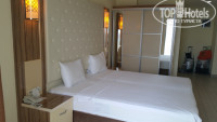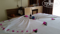 Заехали мы около 12 дня, чемоданы наши забрали сразу же у автобуса, угостили приветственным шампанским и отправили на обед, по возвращении с которого нас уже ждал номер с видом на море (как и бронировали). Номер 2512 во втором корпусе оказался очень просторным для двоих, с большим балконом с видом на море и водную горку. Всё чисто, опрятно, эстетично, включая санузел. Парень, который провожал нас в номер, показал где, что и как работает, включил кондиционер и, откланявшись, ушёл. В августе, конечно, очень жарко, плюс вид на море - солнечная сторона, поэтому кондиционер работал практически круглосуточно. Ежедневная уборка в номере, на мой взгляд, очень качественная, даже не ожидала такого в средней турецкой "пятерке". И это при том, что чаевые каждый день мы не оставляли - всегда проблема с мелочью, зато в конце нашего пребывания от души и с удовольствием поблагодарили горничную более крупной купюрой.
