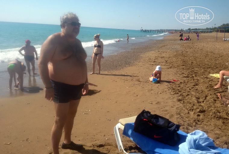 Пляж. Пляж большой , лежаков было много. Но мы загорали прямо у моря. Когда шли в кафе оставляли полотенца и никто их не трогал. Вход в море нас не напрягал. Есть песок, есть тектонические плиты. Если купили пляжную обувь то вообще нет проблем. В воде всегда было много места. Вода чистая, видно дно. С пляжа нам понравилось ходить пешком через лес, хотя