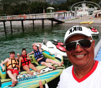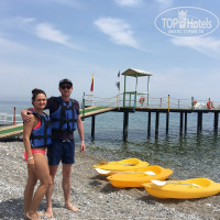 Пляж неплохой, мест было много, галька режет ноги только у самого берега, потерпеть можно легко. Есть мостик с перилами, мы спускались либо с него, либо прыгали с пантона. Вода чистая, прозрачная, только в один день ветром мусор принесло, но к вечеру его уже не было. Бра находится недалеко от пляжа, пройти надо минуту, не больше. Также наливают далеко не все. Между пляжем и дорогой делают вкусные лепешки с брынзой и травами. Там же вечерняя анимация. На пляже работают замечательные ребята Туркеш и Мамед, которые предлагают водные развлечения и прогулки на яхте. Брали у них несколько раз четверную ватрушку (гоняют на катере, фотку приложу), путешествие на большом катере в пещеры, катались на байдарках, в общем, все круто. Туркеш свободно владеет русским языком, у него можно узнать все, что заинтересует. За эти дни он стал нам другом, мы могли просто посидеть вместе, помолчать или посмеяться :)