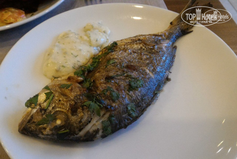 На пляже шикарный бар-ресторан, который находится в теннистом саду.
