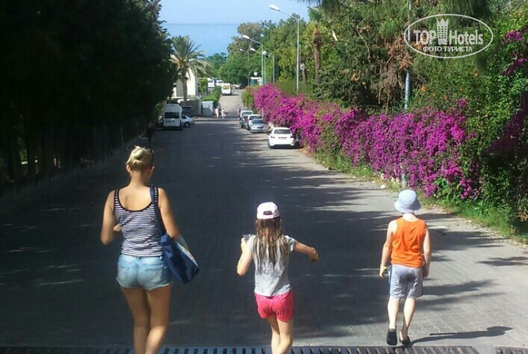 Дорога к морю через отель на против (ходят все, ни каких проблем!),он не большой, потом оживленная дорога с пешеходным переходом ( но у турков не принято притормаживать если кто то стоит на тратуаре и хочет перейти) а дальше спуск вниз к морю..времени занимает минут 10 прогулочным шагом, обратно не много потруднее в горочку конечно...мы ходили после трех часов дня когда солнце особо уже не пекло и возвращались в седьмом часу, поэтому обратный путь был не так сложен))))море чистое, песочек пляж и в море..дети оценили!