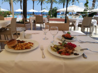 Питание отличное: много мяса (шашлык, котлеты, цельное, тушеное, жареное и тд), рыбы (были стейки семги, жареный окунь, дородаооо) морепродукты (мидии, кальмары, креветки,устрицы), фрукты: черешня, клубника (редко), арбуз, дыня, абрикосы, слива (кислая).