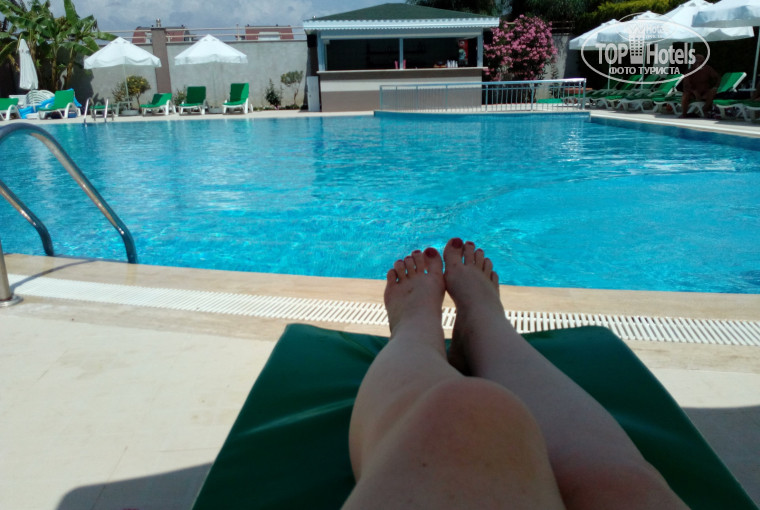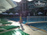 Разделён на две зоны - основную и детскую. У второй глубина примерно по колено. Ребёнок 3 лет спокойно барахтался и развлекался там сам, что удобно, мы просто смотрели с лежаков, которые располагаются по всему периметру в метре от бассейна. Вода чистая, удобные ступеньки для захода.