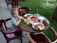 Ресторан один, но еда вкусная и персонал доброжелательный, отзывчивый. Грязной посуды на столе нет, только доел блюдо, за тобой сразу уносят. Можно кушать в помещении, можно на улице рядом с пальмами и бассейном. Периодически шеф-повар выходит и готовит блюдо при гостях. Особенно порадовали мясные блюда и наличие фруктов. Ребёнок каждый день наедался арбузом и черешней, чего в нашем городе в мае в принципе ещё нет.