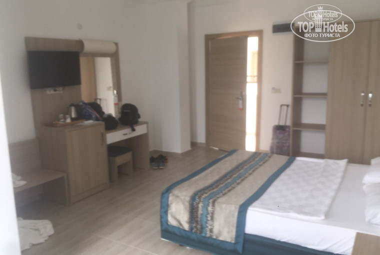 Отдыхали в отеле 7 дней!отель понравился,но на любителя,смотря что Вы хотите от отдыха.Заселили нас сразу по приезду, но номер был неубран,минут через 5 пришли его убирать.Постельное и полотенца меняют каждый день и убираются!Отель новый,номера отличные,современные, персонал приветлив.Полотенца на пляж дают бесплатно,замена 2$.хамам и сауна до 14.00 бесплатно.Сам отель небольшой,народу немного,бассейн тоже небольшой и территория .В июле и в августе ехать не рекомендую,так как там сильная жара, а ресторан находится на улице-сидеть и потеть мало приятно,столики есть и внутри,но без кондера,в обед там очень жарко.Еда- нормальная,можно найти что поесть, но для тех кто едет с целью кушать,этот отель не подойдёт.Салаты все невкусные,поэтому брали овощи, суп только пюре, второе в основном курица, один день была рыба,другой печеньИз фруктов-только арбуз,еще деревянные абрикосы и один раз была черешня. Напитки -пепси,кола,фанта.спиртное мы не пьем, сказать ничего не могу.До пляжа идти 6-8минут спокойным шагом,также каждый час отвозят туда.Шезлонги новые,всем хватает,пляж галечный, напитки до 17на пляже бесплатно.Две горки у бассейна включали только на два часа в день. Аниматоры очень слабые,каждый день одна и та же музыка и игры,что для детей, что для взрослых,ооочень примитивно,но нас это мало волновало, отдыхают в основном с детьми.