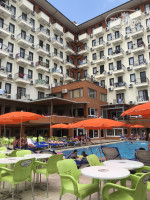 Всем привет, оставлю и я своё скромное мнение об этом отеле) Начну по порядку: отдыхали втроём с подругами с 13 по 21 июня,трансфер конечно в Махмутлар это нечто, но я не в первый раз в Алании, поэтому морально была готова? заселили почти сразу, хотя приехали мы в около 11-00 часов, приветливая девушка турчанка все объяснила, показала, рассказала, оставили чемоданы, пошли к бассейну. Изначально хотели номер с видом на море, но в итоге отказались от этой идеи,так как дорога и большое количество народу у бассейна дают о себе знать??? шумно очень, поэтому когда дали номер 424 с видом на горы и тихий дворик, решили оставить все как есть) поехали дальше, сам номер относительно не плох, три кровати, небольшой балкончик,телик, три тумбочки, вообщем все стандартно, шкаф маленький донельзя, платье повешать не возможно.....потому что внизу спрятан маленький холодильник. Кондиционер есть, работал хорошо, единственное попросили мастера заменить батарейку в пульте.Сейф в номере есть, но мы не пользовались, за все время ничего из номера не пропало......через день оставляли по доллару горничной, убирались нормально, доставляли шампуньки и мыло.Санузел оставляет желать лучшего, занавеска в душе вообще убила,но как мы поняли у многих ванные комнаты получше, поэтому говорю конкретно за наш номер.Касаемо питания нас все устроило, большой выбор овощей, салаты, зелень, куча разнообразных десертов, фрукты были яблоки и арбуз точно, давали курицу и рыбу, мяса особо не видели, сою тоже давали, но мы ее не ели, на самом деле все было очень вкусно и самое главное свежее, так что с голоду не умрете точно? Алкоголь местный, все как обычно, вино белое, красное, раки, джин и пиво, пиво отличное вообще,наливали вроде нормально, пьяных видели???очереди в столовую да,были,но это не смертельно?. Пляж у отеля не плохой, достаточно широкий, но вход не очень, плиты ещё раз плиты, камни и не большой вырубленный заход...... волны были приличные за время нашего отдыха, спокойно не поплаваешь? ну это претензия уж точно не к отелю. Лежаки у бассейна заняты почти всегда, тут и там полотенца, мы там особо не лежали, бассейн чистый, но с львиной долей хлорки?Интернет? Его нет практически, мы в первый день помучались, и уже на следующий день у нас был нормальный интернет) откуда не скажу, но был? Анимация что есть, что нет, пару раз была шоу программа вечером, стандартные мисс и мистер отель.23-00 все выключается и все идут баиньки???Контингент в отеле в основном семьи, средний и старший возраст, молодежи было мало, общаться особо не с кем, благо не в первый раз в Турции, развлекались сами и ездили на экскурсии, на каких ещё не были,брали у Алика, нашла перед поездкой по отзывам в интернете,и отзывы не врут!!! Не пожалели не разу,все очень грамотно и душевно,трансфер от отеля, вечерами если нечего было делать собирались с ребятами из других отелей у него, кальян и вкусный гранатовый чай? остались довольны и экскурсиями и отношением!!! Рекомендую вообщем?? Цены на порядок ниже кстати чем у официалов? Вообщем ребят подытожу, да возможно отель не самый лучший, но главное с каким настроем вы туда едите и с кем) в отеле очень порадовал персонал, начиная от управляющего заканчивая официантами, все очень добрые и отзывчивые, на любые просьбы реагировали моментально. Администраторы на ресепшене Тюлай и Валентина,им отдельное спас