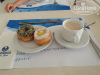 На завтрак была овсяная молочная каша, омлет, глазунья, яйца вареные, картофельные шарики, бекон, шесть видов мюсли, несколько видов сыров, колбас, ветчина, оливки, маслины, помидоры, джемы, три вида йогуртов, разные фрукты нескольких наименований, арбуз, сухофрукты (финики, чернослив, курага, изюм), безумно вкусные круассаны, слоеные булочки-улитки, еще какие то кексы, блины, плюшки и несколько раз в неделю просто обалденные пончики. Наверняка было еще что то , потому что лотков очень много, запомнила то, что брали сами. Много видов чая в пакетиках (и черный, и зеленый, и с ромашкой, и с гранатом, и с клубникой, и с лимоном, и с мятой), несколько видов кофе в кофе-машине.