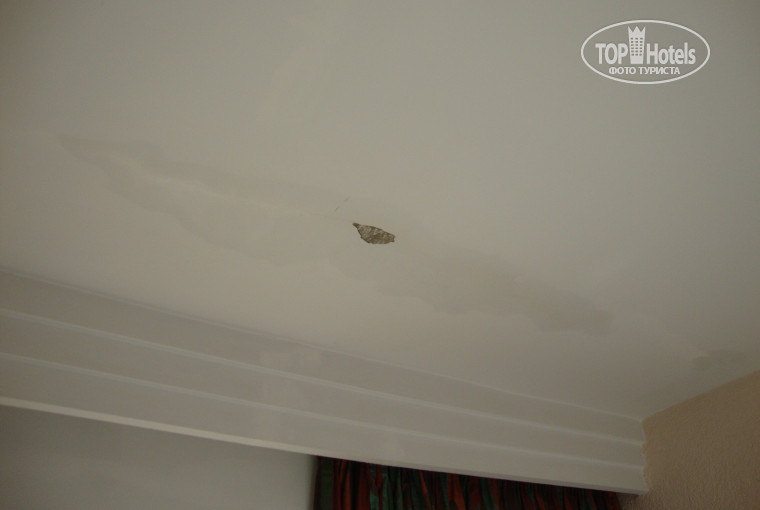 В предпоследний день отпуска пошел дождь, ночью я проснулась от того, что где-то течет вода. Когда включила свет, поняла, что у нас половину номера затопило - в прямом смысле слова. Пятно на потолке, и образовалось как оказалось из-за таких протеков. У нас уже был собран чемодан, и он благополучно намок.