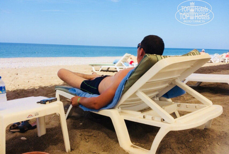 Бар на пляже (кормят в обед горячим, фруктами, салаты), туалет. Зонтики/шезлонги все есть. Места свободные были всегда. Пляж песчаный, вход в море галька - есть места где крупнее, есть места где удобнее заходить - не ленитесь, сделайте 6 шагов в сторону и заходите нормально :) Везде стоят урны, можно выбросить мусор/курить.