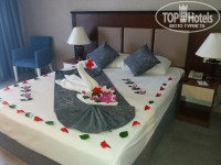 Отдыхали в отеле с 5 по 14 июля вдвоем с мужем. Прилетели авиакомпанией «Северный ветер» из Нижнекамска, вылеты по расписанию, без задержек. Прибыли в отель к 8 утра, оставили чемодан на ресепшн, переоделись в хаммаме и пошли на завтрак. Территория отеля большая, красивая и ухоженная, много зелени и цветов. К 11-00 нас уже заселили в номер 1418 в трехэтажном бунгало Лилия. Номер отремонтирован, с видом на море, с исправной сантехникой и очень красивым оформлением кровати в виде лебедя и цветов. Единственный минус в расселении, что на сайте отеля не указано, что большинство стандартных номеров расположены в самых дальних от моря бунгало, а местность гористая, и мне с травмированной стопой было тяжело подниматься в гору несколько раз в день. Просили о переселении, но на ресепшен не смогли помочь, отель заполнен. В номере убирались ежедневно и приносили воду. Карточку выдают одну на номер, сейф платный.
