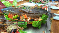 Ужин. Тоже разноообразно по мясу. Порадовало наличие морепродуктов (креветки, мидии). Были салаты из морепродуктов.