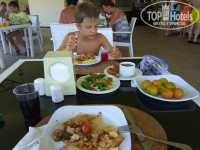 Согласна, наверное среднестатистическому русскому мужику в этом отеле не хватает МЯСА (НАСТОЯЩЕГО-свинины, говядины, не переработанной), но не заметила, чтоб кто-то здорово схуднул без него к концу отдыха (разговаривала со служащим отеля, он объяснил, что говядина ОЧЕНЬ дорого стоит у них +-400 руб/кг , и не каждый турок может себе это позволить, вот и хозяин экономит). Я же любитель как раз овощей и зелени, а их тут во всех видах- в свежем, вареном, жареном, печеном- и на любой вкус...Одни баклажаны с кабачками во фритюре с зеленью и чесночной заправкой чего стоят...