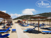 Пляж: Пляж песчаный и очень большой. Пляж общественный, но это никак не влияет на количество отдыхающих на нем. Лежаков и зонтов (бесплатные) очень много — занимать места совершенно бессмысленно даже в выходные (когда греки приезжают отдыхать). Бар на пляже платный, есть водные виды спорта. Вход в море песчаный, но море мелкое — нужно немного пройти, чтобы было не по колено. Море немного прохладное по утрам, ближе к вечеру уже горячее. К концу отпуска море стало резко холодным, даже к вечеру не становится теплым. Думаю, что до конца августа течение не поменяется и море останется очень холодным. Долго в таком море не поплаваешь, так что будьте аккуратнее с маленькими детьми.