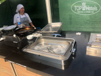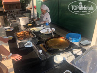 С едой все очень грустно, ассортимента очень мало, из мяса видели только курицу и это крылья, сердечки, печень, один раз давали что-то вроде мяса из шаурмы, накрученное на вертеле, второй раз магазинные замороженные нагетсы. Из гарнира- вечный рис и картошка фри, которая жарилась в черном-черном масле. На завтрак из съедобного омлет. Жарят его тоже на улице на замасленной годами печи, сам омлет наливают из какого-то сомнительного ведра, вокруг ошметки еды, начинки для омлета может не хватить, как и самого омлета. Еду не подносят, кто не успел, тот опоздал. В 19:00 ужин, в 19:30 – что осталось… Фрукты - самые несчастные из всех, что я видела. Много битой посуды, столы часто в пятнах, приборы грязные. Вынуждены были покупать еду в ларьках за пределами отеля, дабы не получить желудочных проблем. По всему ресторану полнейшая АНТИСАНИТАРИЯ, стоят какие-то хоз ящики, картонки от еды, и прочее. Алкоголя наливают по пол стаканы в пластиковые стаканчики, причем настолько плохие, что дно их провисает от жидкости.
