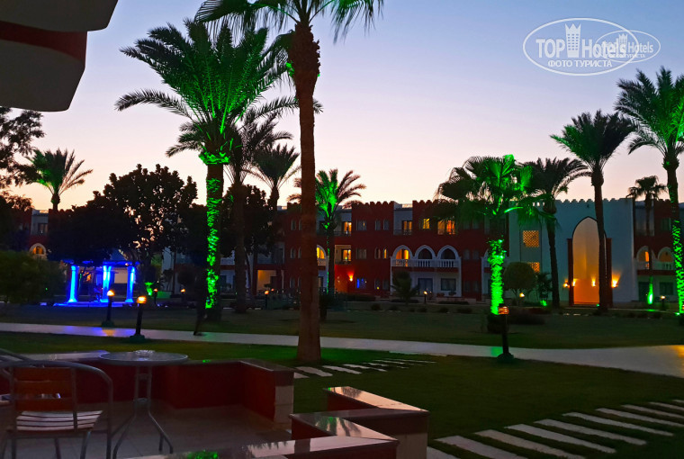 Построен в арабском стиле, территория - ухоженная, зелёная, вечерами всё красиво подсвечено. Заселение прошло быстро, номер получили на первом этаже, трёхместный, где-то в центре территории отеля, так что до пляжа и рецепции было приблизительно одинаковое расстояние. Из нашего корпуса вида на море не было и, в принципе, весь отель расположен так, что хоть какой-то вид на море имеют только два крайние корпуса, но один из них это приватная вилла. Изначально мне хотелось номер на втором этаже, с балконом, но тогда пришлось бы бегать по ступенькам, а это в 40 градусную жару тоже не очень, так что мы менять не стали.