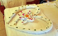 В целом без изысков, обычный, мебель не новая. Широкие кровати, дополнительный диванчик, сейф и биде - это плюсы номера. Ну, а теперь о минусах... Кондиционер шумноват, спать при нём не очень комфортно. Светильники... одни вовсе не работали и были плохо прикручены, другие очень тускло горели, следовательно я не нашла места в номере где-бы можно было благополучно сделать макияж. Вода в унитазе смывается слабо, так что сходить, извиняюсь, по нужде становилось целой проблемой. На второй день прибывания я имела неосторожность прислониться в комнате к столешнице и испортить свой купальник какой-то краской, нанесённой на её углы. Она моментально впиталась в ткань купальника и оставила очень заметные огромные пятна, ну и настроение естественно на оставшиеся дни отдыха было изрядно подпорчено. Как позже нам показал наш уборщик, этой краской у него пестрят уже все губки, которыми он протирает эти столешницы. Не знаю кто виноват, но администрации отеля стоит обратить внимание на то, чем они окрашивают свою мебель.