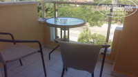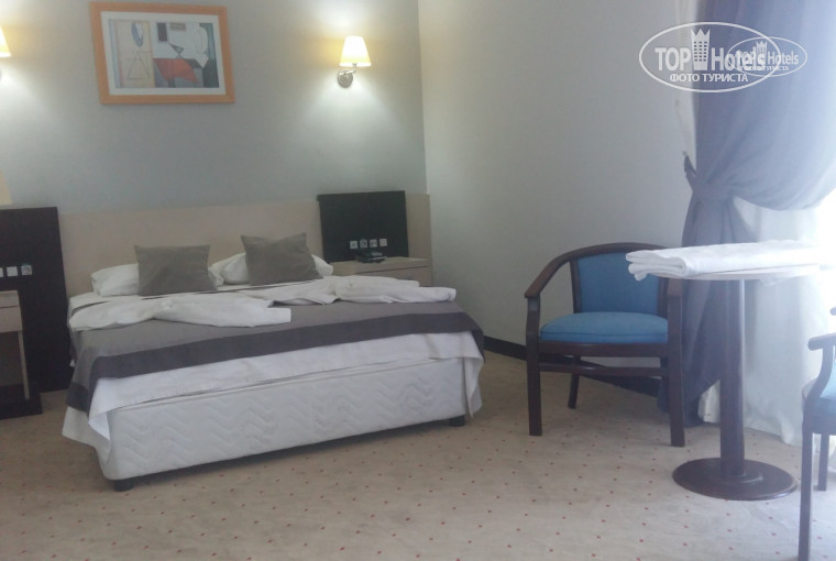 В самом номере: двуспальная кровать, две тумбочки, столик с двумя креслами (еще один столик с креслами на балконе), шкаф в прихожей, телевизор, чашки, стаканы, чайник. Ванная комната небольшая, с маленькой душевой кабиной и очень слабым освещением. Все чисто, аккуратно. Вид из окна на гору Тахталы очень приятный, но тем, у кого чувствительный сон, может не понравиться, что под окном дорога и очень громкие петухи, которые начинают орать часа в 4 утра. Если для вас это важно, не берите mountain-view.