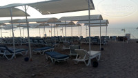 После заселения сразу отправились разведывать, где море. Для того, чтобы до него добраться, нужно выйти через боковые ворота и пройти по вымощенной брусчаткой дорожке между отелями (путь занимает минуты 3-4). Пляж Сириуса достаточно небольшой, но есть шезлонги, которых нам всегда хватало. Кстати, несколько раз видели на нашей территории отдыхающих из соседней пятерки, уж не знаю, чем им наш пляж приглянулся, но факт. Пляжные полотенца можно бесплатно получить в отеле по карточкам, которые выдают при заселении. Сам пляж - смесь песка и гальки, не очень приятно ходить, а вот море прекрасное! Чистое, прозрачное, теплое, без медуз. Мы проводили там каждое утро и вечер. Бар на пляже, действительно, скорее название, но воду там попить можно всегда, а за 1-2 доллара можно заказать фреши в палатке, которая стоит там же.