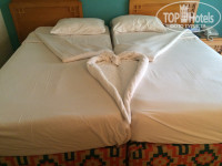 Отдыхали в октябре 2015г.. Приехали в отель мы примерно в обед, на рецепшене нам выдали анкеты для заполнения, после заполнения нас в течение часа заселили в номер. Номер оказался с двумя кроватями, хотя мы заказывали с одной большой кроватью, нам сказали, что можно поменять номер, но завтра))) мы не расстроились и сдвинули две кровати вместе, и ни завтра, ни послезавтра другой номер нам не предлагали, да мы и не спрашивали). Мебель в номере старенькая. Есть балкон со столиком и стульями. Где-то спустя неделю у нас сломалось раковина, мы сообщили об этом, пришёл сотрудник отеля починил, ремонта хватило на пару дней, потом снова сломалась, мы снова об этом сообщили, но на этот раз никто не пришёл))). Уборка в номере хорошая, если оставлять на чай))).