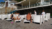 На пляже есть шезлонги, но по утрам они сложены в огромные стопки и таскать вы их будете сами. Заход в море крупная галька, есть большие камни. Глубоко почти сразу. На мой взгляд, с детьми здесь неудобно, они там плавали в нарукавниках и в присутствии родителя, прямо в воде стоящего. Вода очень чистая.