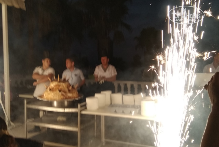 Хочу рассказать о шикарном питании. Вкусно и самое главное разнообразно! Тушеное, вареное,жареное и детский стол. Кулинария очень разнообразна в плане пирожных, суфле и мусов. Фрукты в изобилии, мы с младшей ели арбуз на завтрак, обед, и ужин. Причем он сладкий и вкусный, не из тех что бы было! Стол с разными салатами салатами,травами, в травах не разбираюсь писать не буду. Разнообразные закуски,рулеты из овощей острые и не острые. маринование посвящено также отдельному столу, есть даже маринованный острый перец, помидорки. грибочки. Аж снова слюнки потекли! Один день была живая музыка и был огромный торт от шеф повара с фейерверком. Просто шикарно! Мне еще понравилось, шеф повар выносил с помощниками разный ужин, т.е например, курица целая запеченная в духовке, я такое делаю на соли. или не знаю как называется: на салатном листе три котлетки острые с лимончиком, было вкусно остренько.