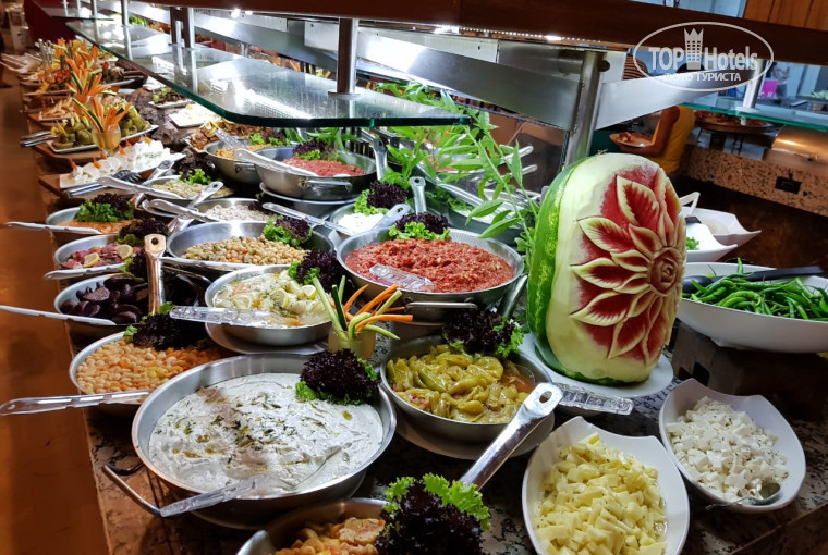 Ресторан в целом неплохой, голодными не останетесь, но блюда все однообразные, исключение - среда (день Турецкой кухни). Мне не понравилось как моют посуду, часто попадались грязные тарелки и т.д., советую тщательно осматривать перед взятием. Несколько раз также попадались грязные стаканы в баре, то помадой испачкано, то ещё чем нибудь-это огромный минус! Отдельно хочу отметить детское меню (отдельный зал) - отвратительно, именно отвратительно. Несколько раз видели суп на завтраке в детском зале, тот который не доели взрослые на ужине!!! Там даже сверху плёнка уже плавала, это просто "капец"! Может, конечно, не успели убрать, но мне лично от этого не легче, ведь ребёнок может прийти и положить себе такой отравы! Во общем к тому, кто отвечает за детский зал необходимо руководству отеля начать задавать вопросы. И вообще, в детском зале практически ничего нет, а если и есть, то то, что можно найти во взрослом зале. Меня поразило отношение к детской кухне, на фоне их общего отношения к детям! Детского питания нет, в 5 минутах ходьбы от отеля есть магазин Sok, в котором продаётся детское питание (цена около 50 рублей, расчёты в Турецкой лире, принимают банковские карты), кроме детского питание продаётся также и другие товары, кроме алкоголя (во всяком случае я не видел), но цены нас приятно удивили. К магазину идти: направо из отеля (вниз), далее поворачиваем на лево (получается перпендикулярно морю) и идём прямо 3-5 минут, упирамся прям в него. Если повернёте ещё раз на лево, после того как спуститесь по указателю со стрелочкой БАЗАР, попадёте на магазины с ценой для туристов!