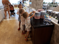Еда. Главный ресторан тоже спокойный, без суеты, столиков много, персонал успевает. Приоритет европейцам, но это везде так. Чаевые тут не последнюю роль играют. Кстати, по ощущениям бОльшая часть гостей русскоговорящие. Есть детская зона, где дети сами могут набирать себе еду, а рядом со взрослым столом маленький столик. Не буду перечислять блюда, но еды было достаточно и для взрослых, и для детей. По отзывам и фоткам в сети дельфин кормят еще лучше, но я и так с удовольствием питался. Мне очень понравилось сравнение дельфина с золотой клеткой в отзыве одного из гостей отеля дельфин. Понравился итальянский семейный ресторан на пляже, записываться и доплачивать не надо. Атмосфера обалденная! Тоже есть столики для детей. Часть блюд из основного ресторана, плюс можно заказать пиццу, пасту или тп. Рыбка на гриле вкусная там.