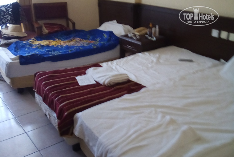 Покупали тур за два дня до поездки.Главный критерий был-близость моря.Отзывы читали,когда путевки были на руках,и,в принципе,уже знали куда ехали.Приехали почти в 10 вечера.Заселили в основной корпус на 2 и 4 этажи.Сначала были конечно расстроены состоянием номера,но на инфо встрече утром было столько претензий от других отдыхающих,что решили,что нам повезло.Да и стали искать плюсы,не за тем мы ехали,чтобы ходить с угрюмыми лицами.Уборка.да,хромает.А в остальном,да все хорошо. Питание разнообразное и хорошее,очередей нет,как в других отелях.Места всем хватает,есть еще на втором этаже ресторан. Курица каждый день,был вкусный шашлык,шаурма,тушеные баклажаны-объедение. Молодцы официанты,очень быстро убирали,и что бы не попросили-тут же принесут.В барах пиво,коктейли-наливали без претензий. На пляже шезлонгов хватало.Правда,первые два дня был шторм,в море не зайти.Хамам в отеле хороший. На экскурсии не собирались,т.к. в Турции не первый раз,да и в Махмутларе тоже-но пообщавшись с ребятами с турагенства,которое находится у самого отеля,не смогли себе отказать в удовольствии отправиться на яхте и на джип сафари.Очень приятные люди,гостеприимные.Да и цены у них радуют. Базар по вторникам-через дорогу от отеля. Минус-в отеле не дают ланч бокс,мы выезжали в два часа ночи,открыли ресторан-но кроме хлопьев и молока ничего нет,да и в такое время ничего не хочется.А вот в аэропорту,перекус был бы в самый раз.И обратная дорога на автобусе просто вымотала.Для такого расстояния все таки надо более комфортабельный транспорт подавать.И все таки отдыхом мы остались довольны,не смотря на мелкие недочеты.Плюсов все таки больше,чем минусов.Море,солнце,вкусная еда и отличное настроение-вот что нужно для хорошего отдыха,и это все у нас было!