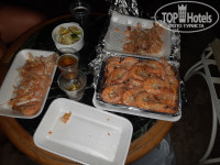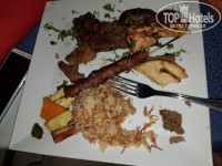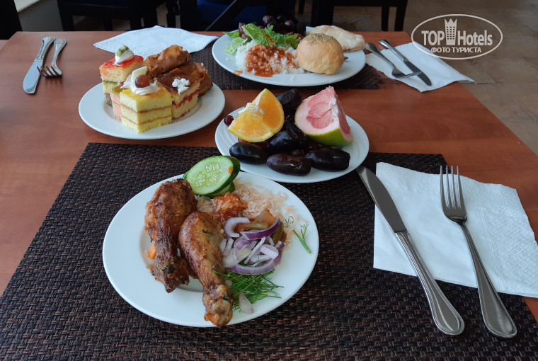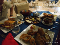 Одели нам браслеты и мы пошли в ресторан на ужин. Питание стандартное для Египта, но все очень вкусно было. Завтрак, омлет с миксом или без, можно попросить просто яичницу, сухие завтраки, йогурты, овощи и фрукты, каши и молочные супы, вареные яйца и булочки. Жаль только кофе ужасный, наливать нужно с краника. Нормальное кофе с машины можно выпить в баре Виктория. На обед разнообразное мясо, картофель, макароны, овощи и фрукты. На ужин рыба в посыпке какой-то, или обжаренная , бывает еще как тушеная, но от одного запаха пара воротит, очень вкусный ляля-хебаб, курица гриль, вообще очень много разнообразного мяса было, но мало рыбных продуктов. Кальмаров, крабов, креветок НЕ ЖДИТЕ. Очень вкусные баклажаны, фасоль, тушеный картофель, пюре картофельное, разнообразные макароны и довольно вкусные супчики просто и крем-супчики. Ужинали в ресторанах Аля-карт нужно было заранее записаться на вечер восточный, рыбный и итальянский. В восточном ресторане все вкусно, но на любителя много острой пищи. рыбный ресторан очень понравился, кальмары в кляре , рыбка запеченная с овощами и рисом .Итальянский ресторан не впечатлил, заказали морского окуня, а принесли рыбу с ресторана ,которую подают в тушеном виде. Извините, но морского окуня мы кушали и видели. Заказали морскую пиццу, там тоже была эта рыба, ну и немного кальмаров. Единственное, что впечатлило это сервис и вкусное белое вино, на барах такое не предложат. Ничего особенного. Обед, завтрак и ужин проходил в ресторане, очень много было местного населения именно поэтому многие продукты выдавали порционно. Поведение у них конечно отвратительное и очень шумное, но не у всех конечно. Спиртное все почти 28 градусов джин, виски, водка, ром, типо самбука, пиво очень вкусное, вино не вкусное. В отеле 2 бара Виктория и "Hollywood" ,второй работает с 19 есть бутылочное пиво, но там плохо понимают по русски, на пляже и возле бассейнов тоже работают бары. Вообщем питание было хорошее, вкусно и расстройств желудка не было, но может не совсем разнообразно.