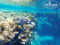 Риф потрясающей красоты, разнообразный и цветной. Подводный мир разнообразен. Мы приходили на море рано утром, перед завтраком, вода была не такой мутной и можно было больше всего увидеть. На второй день мы увидели большую мурену, часто видели скатов, возле понтона детеныша мурены белого цвета, осьминога фиолетового, огромного наполеона, крылатку, из под понтона выбегали крабики, на камушках слева от понтона лежали морские звезды, а вдоль понтона морские ежи. Риф-это главное достоинство этого отеля. С рифом мы не прогадали, много плавали с маской, затаивались в воде и наблюдали за подводным миром. Покупали экскурсию в заповедник Рас-Махаммед, за 25 у.е. коралловый риф там более красочный, чем на территории отеля, но больше ничего нового мы там не увидели. На пляже 2 понтона, столпотворения людей не было. Единственное, не совсем удобно было взбираться на понтон, когда на лестнице болтается толпа из местного населения в спасательных жилетах, приходилось раздвигать их. Лежаки старые, некоторые совсем растянутые. Пора бы было их заменить. В обед на пляже жарили картошку фри и делали гамбургеры, можно было перекусить. Что всегда и делало местное население, после них валялись тарелки, куча еды и стаканчики. Жалко, что никто не заставил их это убрать. Работают 3 бассейна , один из них джакузи, но мы там не плавали , а приходили сделать фото. В центральном бассейне работали горки, но в определенное время.