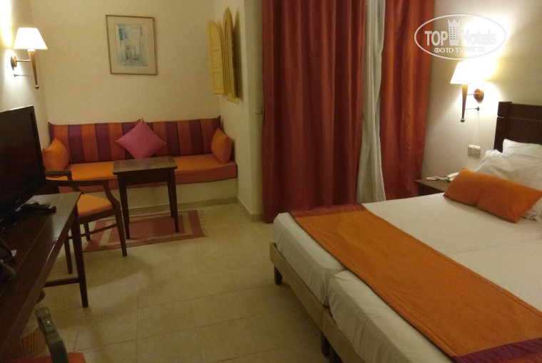 5. Ресторан и питание. Система all inclusive. По моему впечатлению отличается от турецкой не в лучшую сторону. Как многие уже писали в своих отзывах - голодными вы не останетесь это точно. Завтраки : выпечка (круасаны, булочки и пр.) вкуснейшая и свежайшая , отварные яйца, сыры и творог, джемы, шок.паста, иногда каша, хлопья и пр. Жарят омлет и пекут блинчики на уличной кухне. Кофеавтомат (6 видов) и чай в пакетах. Обеды и ужины примерно одинаковые : мясо (говядина и баранина), птица (индейка и курица) - постоянно, рыба (тунец, телапия и пр.). Тунец очень даже!(напоминает осетрину). Салаты, овощи, маслины, сыры и т.д. и т.п. Из сладкого большого разнообразия нет, но вкусняшки были постоянно. Из фруктов - арбуз, дыня, финики, слива, яблоки, груша, гранат, апельсины. Из алкоголя - вино : красное, розовое (лучшее из всех) и белое. Пиво и напитки. Столов хватало, очередь только на гриле, посуда и приборы всегда в наличии, официанты быстро убирали освободившиеся столики. Если официанту дают бакшиш - то он вас и встречает, резервирует и украшает столик, подносит напитки и следит за обслуживанием вашего столика, пока вы питаетесь. 6.Пляж и море. Берег песчаный, пологий, водорослей на берегу много, убирают и в ручную и трактором, но где-то после 9-00 утра, если вы приходите раньше ( а мы именно так и приходили), то видите всю эту "прелесть". Лежаки 2 вида с сеткой и пластиковые жесткие, без матрасов (минус), в достаточном количестве, так же как и укрытия от солнца. Дорога до пляжа 210 метров (замеряли - 420 шагов) по бетонной дорожке среди пальм и растительности. Само море если не штормит, то бирюзовое прозрачное с везде плавающими водорослями, - это не критично, но и не очень приятно. Заход в море бывает усеян камнями (после непогоды или шторма). Из 11 дней свободно плавали 3 дня, 4 дня были волны, но мы купались, 3 дня вообще не заходили , т.к. штормило, шел дождь и дул сильный ветер и было прохладно.