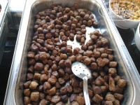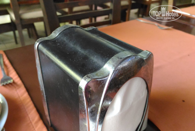 3) Еда омерзительная. На третий день начало тошнить от одной мысли посещения столовки. Именно столовки - подобный гадюшник я видел только в школьных столовых. Фотографии тоже есть. Чтобы вы понимали - вот эти шарики коричневого цвета и непонятного вкуса это, по мнению "шеф-повара" - лосось. ЛОСОСЬ!!!! Вы только вдумайтесь. Рядом с этим собачьим кормом стоит бирка "Лосось"!!! Мне даже добавить нечего... Ах нет, есть! Прикладываю ещё фотографию салфетницы на столе. Тоже очень наглядно.