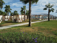 Территория отеля большая, зеленая, чистая красивая есть где сделать фото на память. Температура днем в среднем 35-38 градусов, море теплое, единственный минус рядом впадает речка, которая сильно влияет на температуру воды. То теплая, то холодная. Ходили на пляж черных браслетов, вход хоть и ограничен камнями, но вода однородно теплая, чище, людей меньше, а потом и вовсе переходили на пляж соседнего отеля. Шезлонгов много, сложностей найти места на четверых человек не возникало. Пляж не плохой, песочек и иногда море выносит после шторма мелкую гальку.
