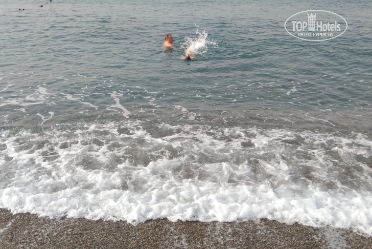 До моря не спеша 5-7 минут...Море теплое, прозрачное, без приспособлений можно увидеть рыбок. Вход в море мелкая галька. На пляже есть горка для детей. Лежаков хватает. Бар работает с 10-00 до 16-00, с 12-00 там же можно покушать.