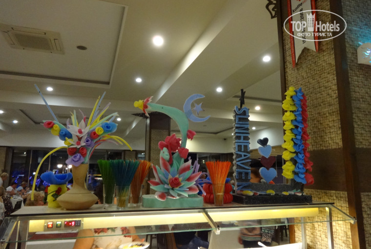 Про еду писали хорошо и правду. Подтверждаю. На мой взгляд, всего очень много.Очень порадовало, что ежедневно была рыба. На мой взгляд, отель был полностью заселен. Но несмотря на это сотрудники ресторана работали четко и слажено. Да были небольшие очереди, но обслуживание проходило быстро. Уборка столов тоже производилась быстро. Места всегда были. Убирали в основном молодые ребята. Очень доброжелательные. Я видела, как малыш нес тарелку с едой и уронил ее. Соответственно тарелка разбилась, еда на полу. Молодой человек только улыбнулся, погладил малыша по голове и стал все убирать. Про спиртное в барах ничего не могу сказать, т.к. не пробовала. Вино в ресторане в обед и ужин. Нормальное столовое вино. В некоторых отзывах прочитала про грязные скатерти. В глаза сильно не бросалось. Все менялось быстро и постоянно.А если и были пятна на скатертях, то еще и потому, что отдыхающие набирают на тарелки такое количество еды, что она еле вмещается на тарелку и соответственно пачкает скатерти. Вода в отеле везде. Это меня тоже очень порадовало, т.к. я ее очень люблю. Да, с утра холодильник закрыт, но ее можно взять в обед и ужин сколько нужно. В ресторане утром есть кулер с водой. Если вода очень нужна, возьмите бутылку и наберете. Кулер с водой есть и на пляже. Очень удобна запечатанная в стаканчики вода. Берите сколько хотите в холодильнике. Даже стоит на столах.