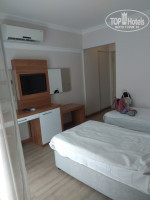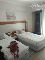 Этаж 3. На первый взгляд комната приятная, не большая, но уютная. Все есть, кровать, телевизор-показывает плохо,пульт еле дышит; холодильник-печаль беда, пустой, работает плохо, пахнет чем то; кондиционер-расположен не удачно на мой взгляд прямо напротив кровати, тумбочки; зеркала; шкаф, вещи найдете куда сложить, но мне было мало вешалок; сейф платный, не пользовалась; чайник с сахаром,чаем,кофе, кружки; телефон; балкон-достаточно маленький, кое-как впиханы два стула и стол с пепельницей, есть на стене специальные перекладины для сушки белья, вид с балкона на рядом стоящее здание и немного в проёме видно море- приятность. Постельное белье не первой свежести, серое,но чистое. Обои в каких то брызгах чая или ещё чего. И вот если присмотреться, то номер был грязный, на полу не помыто, во всех углах не одним днём накопленный песочек, на тумбочках и столе пыльно. Большое количество влажных салфеток спасли от грязи на поверхностях мебели. Шторки чистые. Ванная и туалет - тесно. Раковина красивая, есть фен,зеркало, кусочек мыла и бутылек шампуня. Для 4* отеля можно было бы выделить жидкое мыло или гель для душа в дозаторе. В наличии комплект полотенец и немного неприятный момент-это душевая. Ее отделяла перегородка из стекла и все, когда моешься вся вода течет по полу образуя лужу и ни как это было не исправить. Помыться, не устроив потоп, представляло ювелирную работу. В общем коридоре на этаже какой-то непонятный ковер, лучше бы его не было.
