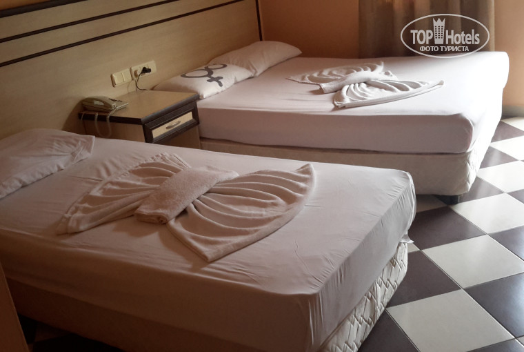 НОМЕР. У нас в номере было две кровати , одна односпальная и другая двухспальная кровати, постельное бельё было белоснежное, практически такие же и полотенца, так же телевизор, кондиционер, пара тумбочек, пуфик шкаф с вешалками, холодильника в номере нет. На балконе два стула и столик, пепельница для курящих. В туалете есть фен душевая кабина, хоть и небольшая, но чистенькая, и из неё ничего не вытекало на пол... Вот что не понравилось, так это мягкие сидения на унитазе, и то что совсем нет вытяжки, Вернее она есть, это маленькое окошечко с выходом в корридор, и другое окошечко в номер к соседям. От сюда суммашедшая слышимость, неприятный момент... Перед заселение спросила можно ли оплатить мини бар на время отдыха, сказали что в отеле нет холодильников даже за деньги. Но потом в одном из номеров, где отдыхала пара из Германии, минибар всё таки был замечен. .. Было чуть-чуть неприятно.