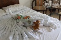Приехали в отель, нам сказали, что нужно подождать заселения. Ждали около часа, уже заселили тех, кто приехал позже нас, дали на рецепшене денег и сразу появился свободный номер. Подошел мужчина, взял чемоданы, проводил в номер и начал показывать как включается свет, где сейф, завесил-развесил шторы, показал как работает вентиляция в туалете и так по кругу раза 4, дали денег, он сказал "Спасибо" и удалился. Номер большой, мебель старая. Шокировало, что в туалете из вентиляции летали комары, возможно это сезонное, но довольно не приятно. Из балкона боковой вид на море. Убирать приходил молодой парень каждый день, оставили чаевые, он сделал крокодила из полотенец.
