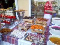 2. Питание отменное! Очень вкусно готовят и разнообразно. Ни разу не было кислого. Мяса много и разной рыбы ежедневно (на гриле, на пару, красная соленая, белая) почти ежедневно салат с кальмарами, креветками, крабовыми палочками, мидии очень вкусные в кляре. Борщ очень вкусный! Пельмени были, перцы фаршированные, да можно много всего перечислять) Сладости на любой вкус, и яблоки в карамели и рахат лукум и халва все очень вкусное. Сухофруктов каждый день в изобилии, утром стояли одноразовые емкости куда можно было наложить и взять с собой на пляж. Мороженое вкусное в рожках, очередей никогда не было. Пообедать у бассейна также можно без проблем. Лепешки гезлеме тоже есть. На пляже бар, где можно взять воду в бутылках, напитки, пиво, айран в стаканчиках. На пирсе также есть бар.