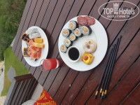 На нашей половине был достаточно уединенный пляж с лежаками, зонтиками, водными каяками, ресторан с завтрами с морским видом: огромный выбор еды: местной, вегетарианской, колбасы, сыры, яичница с плиты, сладкое, фрукты...
