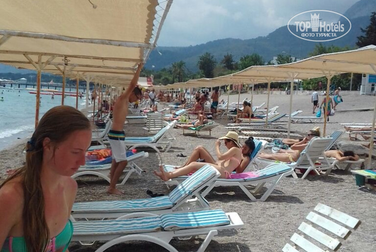 Море: пешком минут 8 медленным шагом по тихой улочке вдоль гранатов и цветов. У отеля своего пляжа нет, но есть лежаки на общем пляже под тентами. Мы приходили часов в 9 и всегда находили места. Позже сложнее найти свободные. Заход в море - камни, поэтому чувствительным придется купить тапочки. Я обходилась без них, маме и детям пришлось купить. Море чистое, теплое.