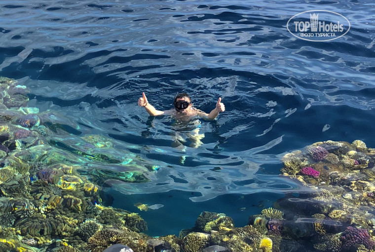 Пляж также каскадный, есть площадки на трёх уровнях, всегда можно найти укромное местечко, и отовсюду прекрасный вид на море. Риф очень красивый, много рыбок, но с пирса всего одна лестница для спуска в море, иногда там образовывалась «пробка» и приходилось ждать чтобы выйти или зайти в воду.