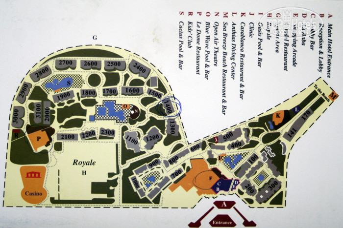 Территория очень большая, ухоженная, клумбы с цветами и кактусами. Много бассейнов, у которых загорают англичане. Бунгало в традиционном восточном стиле, всё как во всех отелях, только очень старое.