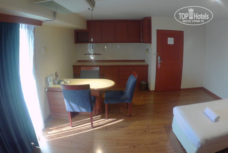 Расположение удобное, две комнаты (удобно с взрослым ребёнком), есть всё необходимое, но всё очень – очень не новое. Если там сделать хороший ремонт, то было бы прекрасно, а так всё весьма посредственно. Огромный плюс – это шумоизоляция, находясь в номере не слышно ничего, только в первой комнате (при входе) иногда слышны звуки останавливающегося лифта. Жили мы на 34 этаже, причём по иронии судьбы оба раза в одном и том же номере. Окна и балкон закрыты во избежание несчастных случаев (видимо были). В вашем распоряжении: эл. чайник, чашки, чай, кофе, вода (0,5 л на человека) – бесплатно, мини бар в холодильнике – за деньги. Вход в номер по карте, соответственно электричество тоже (работают и другие карты), для того, чтобы воспользоваться лифтом тоже нужна карта. Спуститься вниз или в лобби можно и без неё, а вот подняться на этаж к себе в номер, в бассейн (на 11 этаже) или в ресторан (на 43 этаже) нужно вставить карту в специальный разъём, нажать кнопку нужного этажа и … вы в пути.