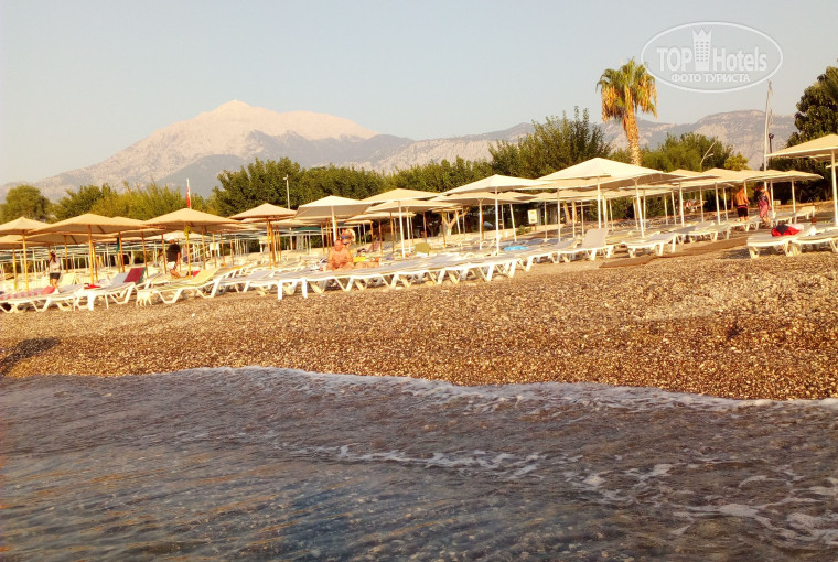 Отель на 4*. Заселили нас примерно через час после приезда в номер на 4 этаже с видом на главный вход, откуда было немного видно море. Вся техника в номере работала исправно, убирали каждый день, проблем с горячей водой никогда не было, за номер ставлю 5. К ресторану претензий тоже нет, еда разнообразная, различные напитки как алкогольные так без алкогольные, мясо куры , говядины, рыба, фрукты всегда были: яблоки, сливы, арбузы, дыни и т.п. Официанты доброжелательные, пытались вовремя все убрать, протереть, хотя иногда и не справлялись (поток туристов был огромный). До пляжа идти минут 10 от силы, неудобное время 12 часов дня для мороженого, перед обедом...Пляж плохо убирали от мусора (валялось много окурков, стаканчиков), шезлонгов всегда хватало, море бесподобное, заход в море тоже хороший. Огромный минус отелю за анимацию...днем ее почти не было, делать зарядку и ходить на йогу приходилось с аниматорами соседнего отеля ))) Вечером изредка проводились пошлые конкурсы с подвыпившими отдыхающими, ужасно...или в афише было написано одно, а по факту другое шоу или совсем ничего. Не смотря на нек.минусы, мы бы еще раз приехали в этот отель.