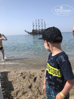 Бассейны чистые, в апреле холодные, я не купалась. Ребёнок купался в бассейне 40 см, он прогревался на солнце. До пляжа идти 3 минуты, через подземный переход. На пирсе лежаки, зонтики, беседки с соломенной крышей, было даже 2 ванны, но все только готовилось к сезону, мы не пользовались. Пляж маленький, вход в море местами камни, но нам это не помешало, как и то что море в конце апреля холодное))) зато на солнце днём жара, загорели отлично! Анимация на пляже проводит аквааэробику в воде(по камням не очень удобно) и бочу(пляж и так маленький, играть в неё негде). На фото из описания отеля видела пляж из двух частей, но на вторую не пройти, только вплавь или по камням. Если учесть что в конце апреля народу было не много, но весь пляж занят, представляю что там творится летом, негде будет лечь. Иногда на пляж заходит официант и принимает заказы на напитки, приносит долго, проще сходить самим. На верхнем уровне, стоят лежали и топчаны, там красиво смотреть закат. Жаль что бар на пляже работает до 16.