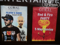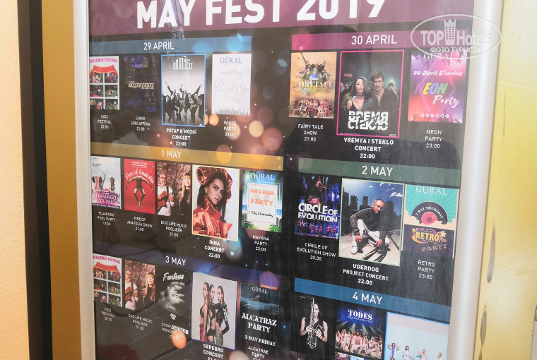 Вообще в отеле как минимум 5 площадок для шоу ,две для детей ,одна для небольших шоу ,скорее всего для зимнего периода и две большие сцены – одна амфитеатр ,где проходят стандартные шоу с 21-00 до 22-00 ,это профессиональный цирк ,акробаты и танцоры различные и главная сцена ,вот она уровня профессиональных концертных площадок .Свет ,звук и т.д. супер , на этой площадке проходили концерты с 22-00 до 23-00 ,далее фейрверк ежедневный , дискотека до 24-00 . 29 апреля был Потап и Мозги ,30.04 – Время и Стекло ,1 И 2 мая – иностранцы – INNA и The Underdog Project ,3 мая – Серебро ,5 Мая – DJ Филатов и Карась ,все концерты полноценные , танцы почти на сцене ,с прекрасным световым и файр шоу . А фейерверк ежедневный примерно как на 9 мая у нас в Самаре . В общем анимация сумасшедшего уровня . В январе были в Риксос Сангейт ,тоже были концерты ,но как то не было шоу ,не было ощущения праздника ,а здесь прям адреналин .