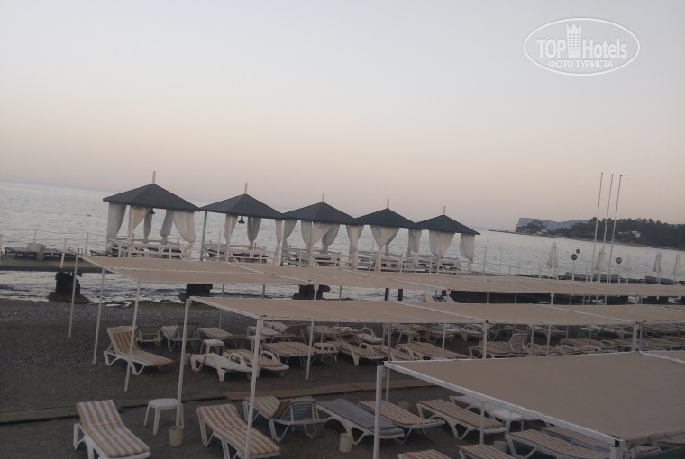 Территория очень красивая, ухоженная, не сильно большая, радует глаз) а вот до пирса реставрация не дошла, к сожалению. Спуск на пляж с коляской проблемный, дорожек мало. Сам пляж мелькая галька, не забудьте спец.обувь. Мы ходили купаться слевой стороны от отеля, ближе к соседнему Шервуду. Там галька лучше.